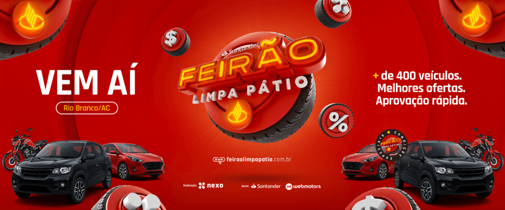 A Nexo Comunicação, em parceria com o Santander e a Webmotors, anuncia a chegada do Feirão Limpa Pátio a Rio Branco, no Acre. O evento promete agitar o mercado automotivo da região com um portfólio de mais de 400 veículos, entre carros e motos, reunindo as melhores ofertas e condições diferenciadas para quem quer sair com o veículo dos sonhos sem complicação.